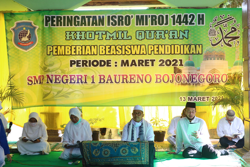 Pada hari Sabtu, tanggal 13 Maret 2021, SMPN 1 Baureno mengadakan Peringatan Isra Mikraj Nabi Muhammad SAW 1442 H. Kegiatan tersebut dilaksanakan bersamaan dengan kegiatan Khotmil Qur'an dan Pemberian Beasiswa Pendidikan Periode Maret 2021. Bertempat di Aula SMPN 1 Baureno, acara tersebut dihadiri oleh Bapak/Ibu guru, tenaga administasi sekolah, dan perwakilan pihak BAZNAS. Selain itu, acara ini juga diikuti oleh perwakilan pengurus OSIS, siswa penerima beasiswa pendidikan beserta orang tua. Acara ini berjalan dengan tertib dan lancar. Acara yang dimulai pukul 07.30 ini diawali dengan pembacaan kalam Illahi dan prosesi Khotmil Quran. Acara dilanjutkan dengan penyerahan beasiswa pendidikan dari sekolah terhadap 15 siswa oleh Ibu Kepala SMPN 1 Baureno, Ibu Siti Nuryani, M.Pd. Selain itu juga terdapat 3 siswa yang mendapatkan beasiswa dari BAZNAS. Pemberian beasiswa yang berasal dari sedekah harian warga SMPN 1 Baureno dan juga BAZNAS ini diharapkan dapat bermanfaat bagi siswa-siswi. Setelah penyerahan beasiswa, acara dilanjutkan dengan ceramah keagamaan dalam rangka Isra Mikraj Nabi Muhammad SAW oleh Bapak K.H. Asy'ari Ahmad dari BAZNAS. Kegiatan ini diharapkan mampu menambah pengetahuan warga sekolah tentang perjalanan Isra dan Mikraj Nabi Muhammad SAW sekaligus menambah keimanan kita.